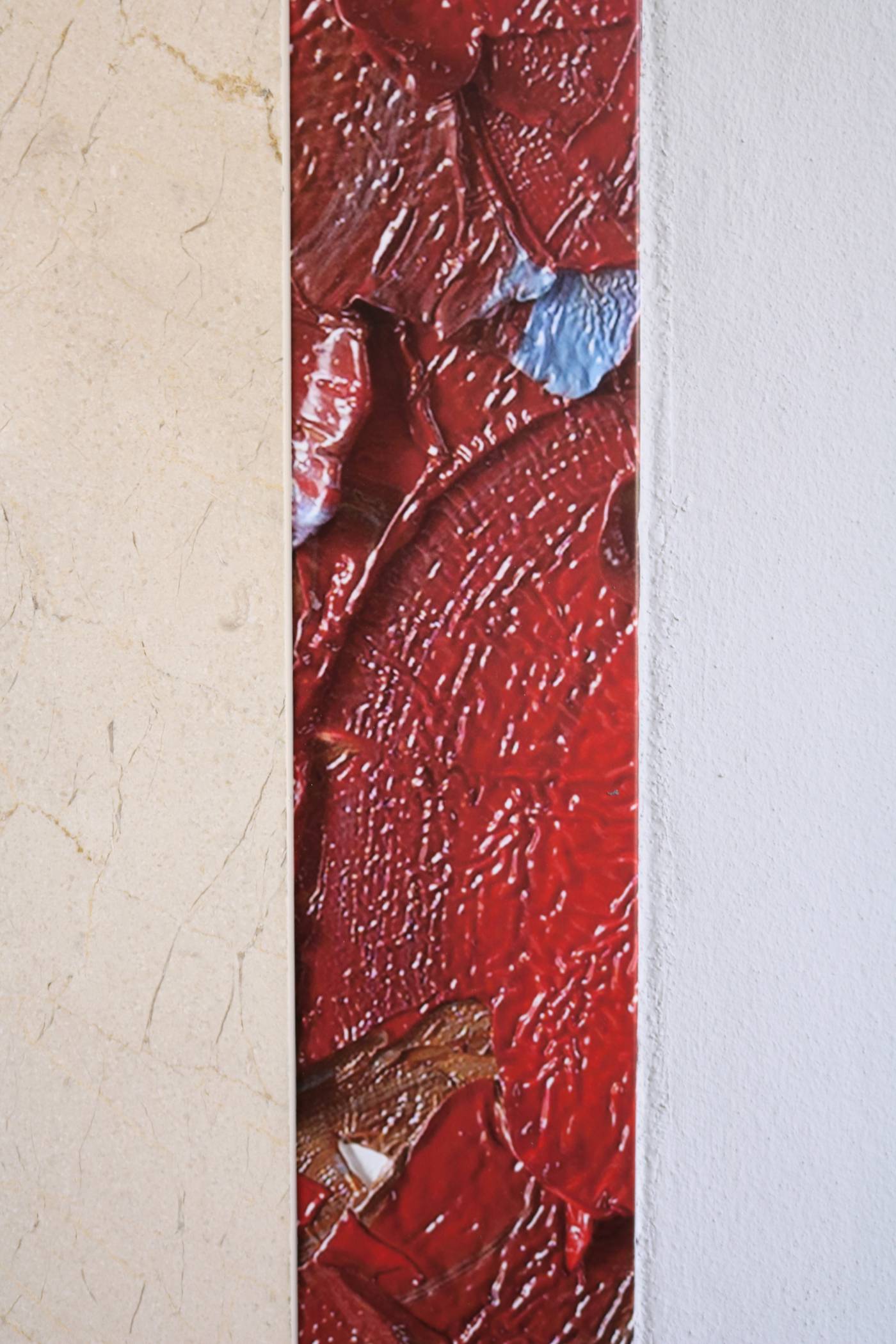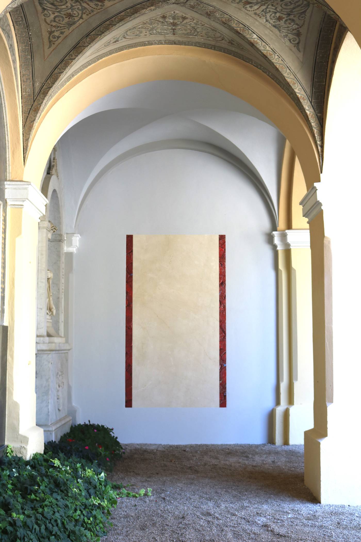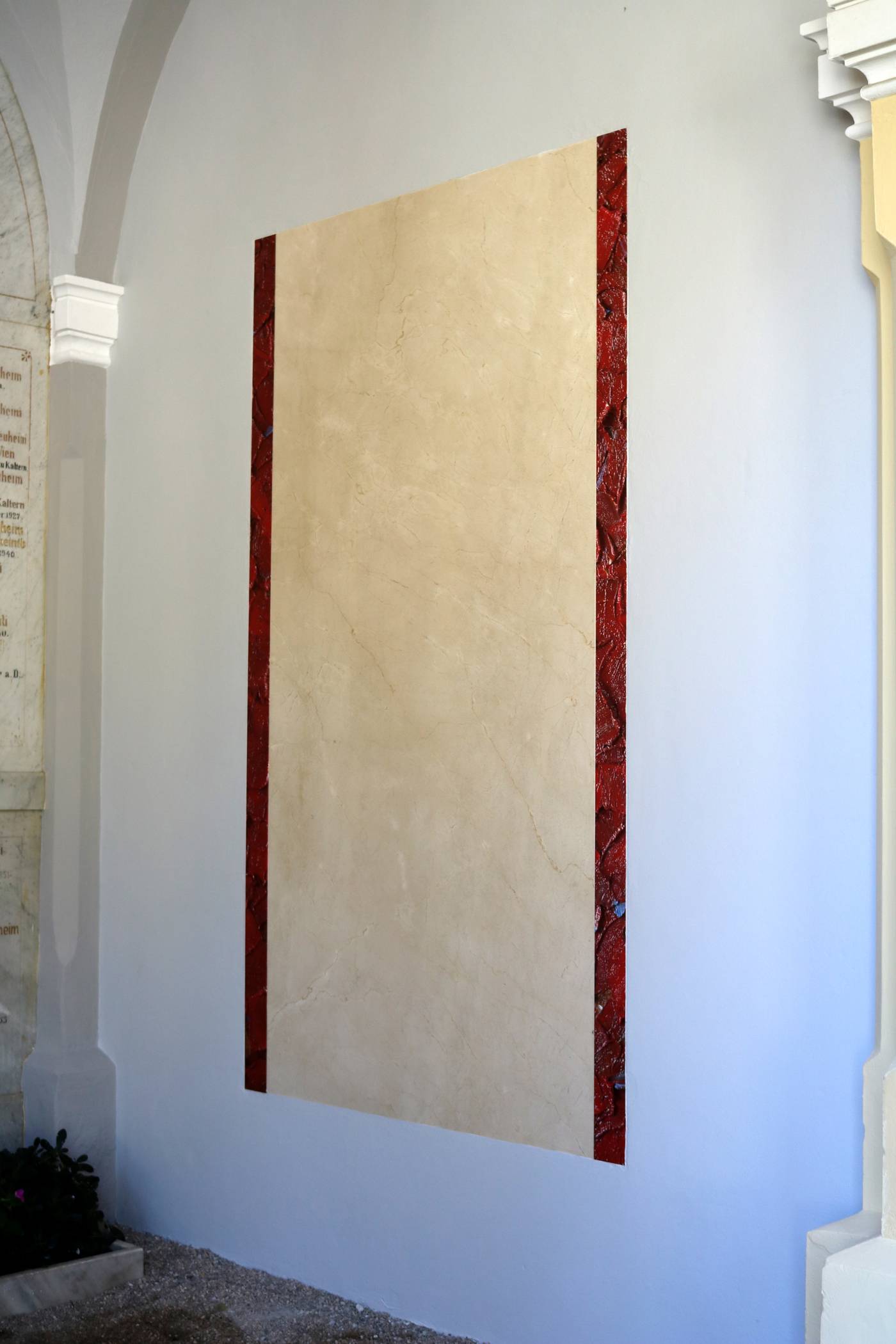 Dem Projekt liegt eine sensible Aufgabenstellung zu Grunde, die, versehen mit einer subtilen künstlerischen Gestaltung ein hohes Maß an symbolischer, persönlicher und konzeptueller Eloquenz aufweist. Im Ergebnis handelt es sich um den Einbau einer Kalksteintafel, die beidseitig mit einem schmalen, malerischen Bildstreifen versehen ist und bündig in die bestehende Arkadenwand eingesetzt wurde. Die Wandfarbe, die das Bildobjekt umgibt, ist dezent gehalten und so gewählt, dass es im Gesamtbild optisch und farblich ein harmonisches Ganzes ergibt. Name, Geburts- und Sterbedaten werden bei Bedarf direkt in die Kalksteintafel eingeschrieben.